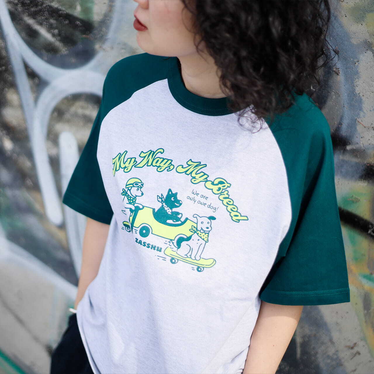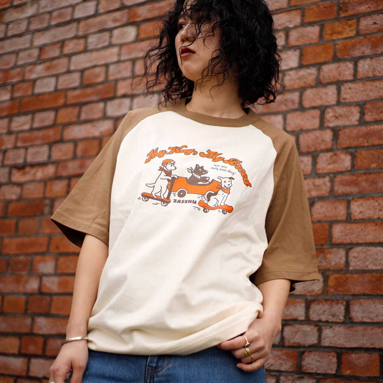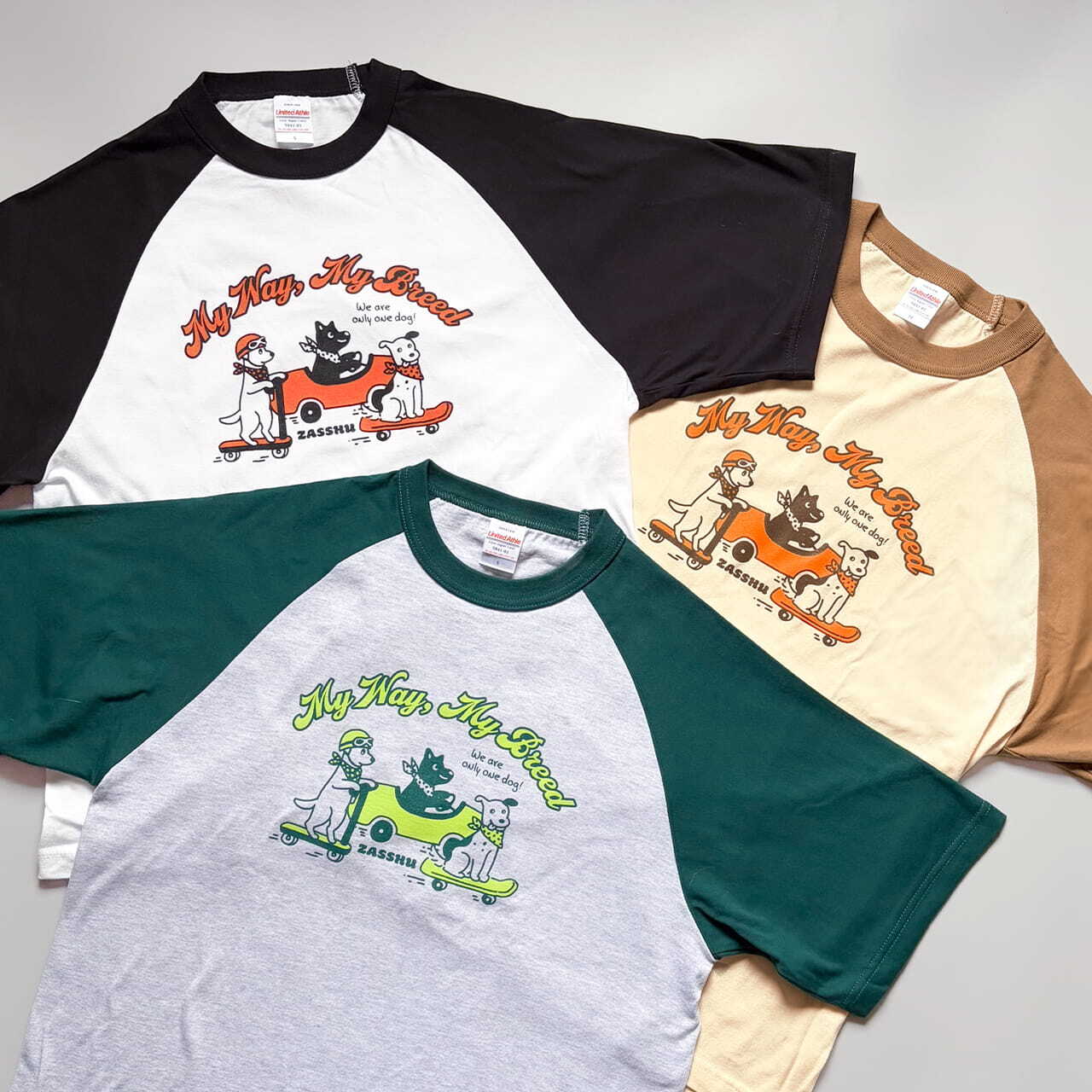 犬種という枠にはまらない雑種たちにぴったりなフレーズと、それぞれ違う乗り物に乗ったレトロテイストな犬たちのイラストをプリントしたTシャツです。