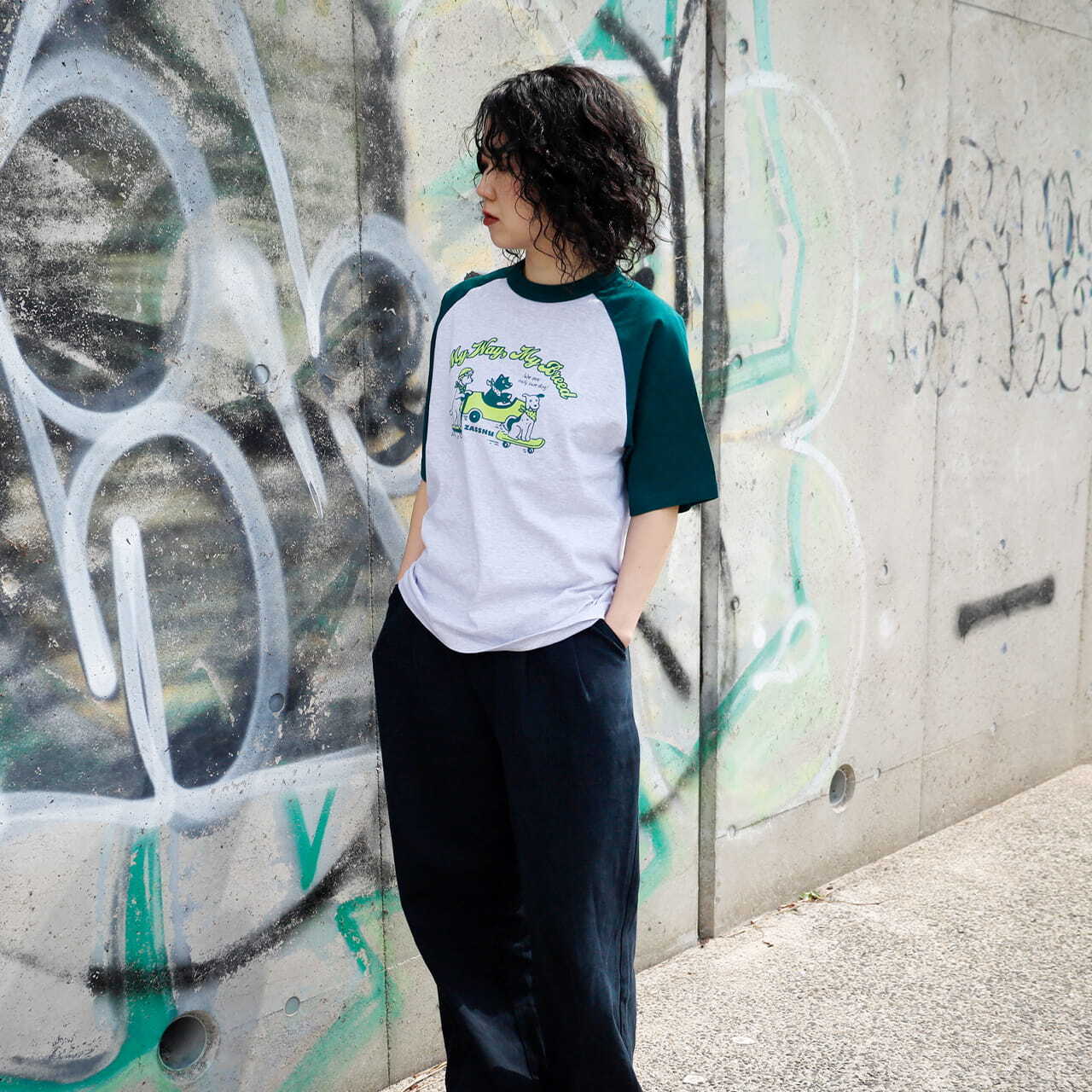 袖が切り替えで2トーンになっているラグランスリーブはスポーティーな雰囲気を醸し出し、これだけで着映えします。